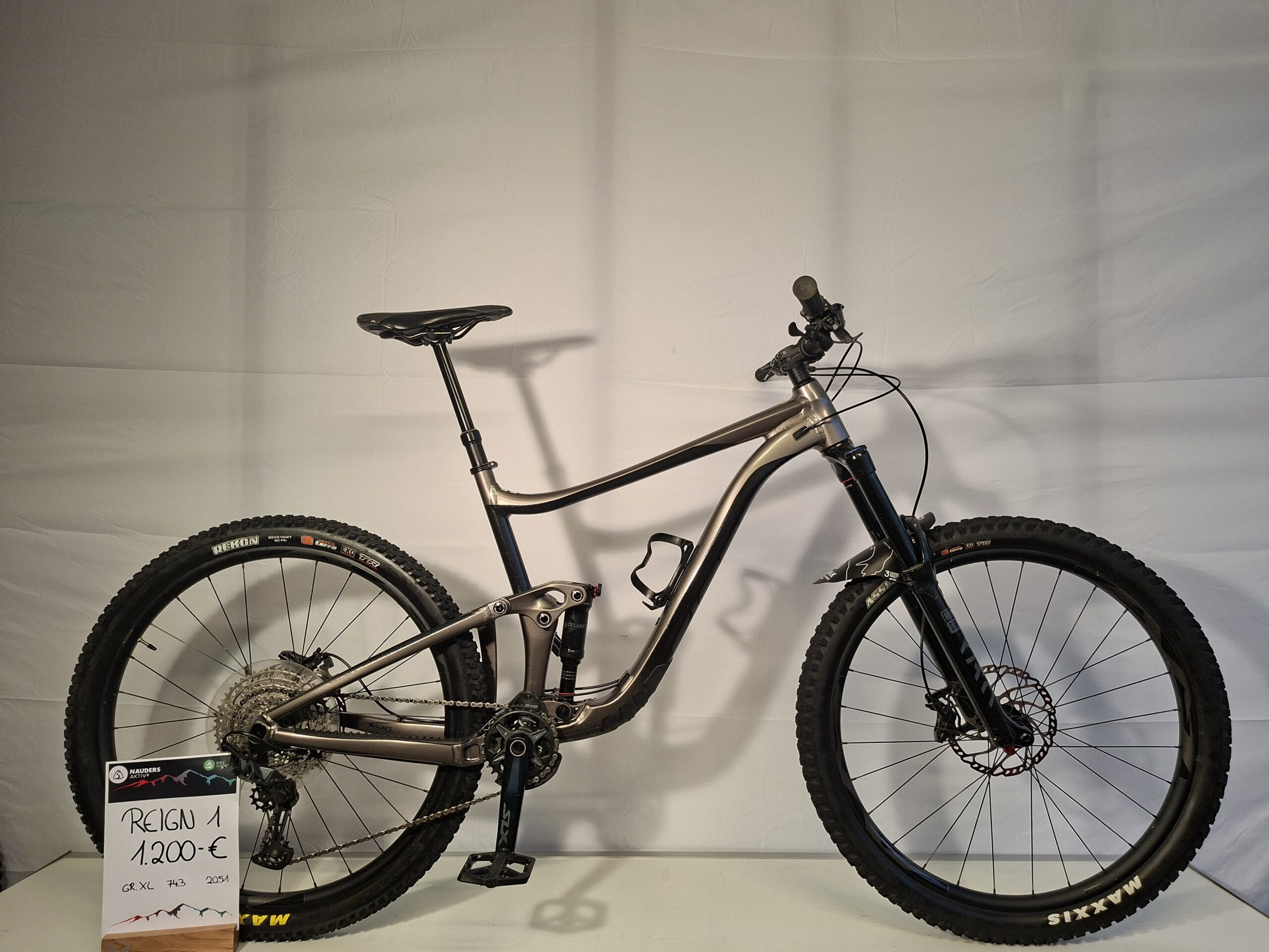 Ein 29″ Enduro-Mountainbike mit Aluminiumrahmen und Vollfederung mit gehobenen Mittelklasse-Komponenten.